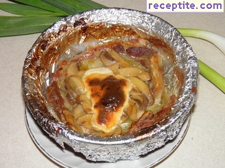 Пържолите се начукват. Откъсваме от фолиото парче, което да е по-голямо от пържолата Осоляваме и поръсваме с черния пипер пържолата и я поставяме в средата на парчето фолио. Върху пържолата поставяме парче моцарела, лук, нарязан на лунички, гъби (ако гъбите са пресни предварително ги сваряваме). Най-отгоре покриваме с парчета топено сирене. Сгъваме фолиото така че да се получи вързопче. Нареждаме в тава и печем във фурната около 1 час.