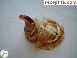 Ябълката се разрязва наполовина и се отрязват 2 парчета като полумесец - не много дебели. Две палачинки се намазват тънко със сладко и в единия край се слага 1 парче ябълка, като половината остава отвън като глава, а другата се се завива с палачинката, но така че да се оформи като птица. С парченца от ябълката се оформят крилата. От нарязани тънки парчета ябълка се правят розички за декорация. Другите 2 палачинки се сгъват на триъгълник. В чиния се нареждат два лебеда един срещу друг, а отстрани - другите 2 палачинки и се украсяват със сметна или друго по избор.