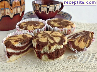 Във формите за мъфини се поставят хартиени капсули. Във всяка капсула се поставя по 1 ч.л. от бялата смес, след това отгоре, в центъра - 1 ч.л. от какаовата смес. Редуват се докато капсулите се напълнят до горе (за разлика от обикновените мъфини, при които се пълни 2/3 от обема на формите). С помощта на дървено шишче се оформят цветчетата (с върха се очертават черти - по диагонал и на кръст; от центъра към стената; от стената към центъра и пр. )