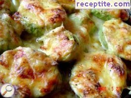 Тиквичките се измиват и се нарязват на филии по дължина. Ако тиквичките са големи се разрязват и на две напречно. Осоляват се леко и се оставят да се отцедят. Беконът се нарязва на малки кубчета и се запържва леко в 2 с.л. олио, изважда се и се оставя настрани. В същото олио се запържва до златисто нарязаният на шайби лук, след което се изважда и се оставя настрани. Добавя се останалото олио и в него се изпържват до златисто тиквичките. Чесънът се пресова и се добавя към доматите, заедно с нарязаните на ситно подправки. В подходяща огнеупорна форма се подреждат на слоеве тиквичките, беконът и доматеният сос. Овкусява се със сол и черен пипер. Най-отгоре се поръсва с настърганото сирене. Пече се на 250С около 10 минути. Сервира се горещо.