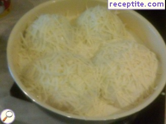 Пригответе сос Бешамел: в подходящ съд сложете маслото, олиото и подправките, добавете брашното и запържете. Внимателно сложете млякото и водата и бъркайте докато соса се сгъсти. Накрая настържете чесъна.