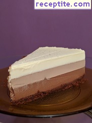 Слагаме първата част, заедно със захарта и черния шоколад на котлона и бъркаме докато се разтопи шоколада. Сваляме от огъня и прибавяме желатина (желатина първо се слага в малко студена вода да набъбне, после се слага на водна баня да се стопи и тогава се прибавя към крема). Изсипваме сместа върху блата. Оставяме в хладилника да стегне (около 2 часа). След като първия крем е стегнал напълно, приготвяме втория по същия начин, но с млечен шоколад. Изсипваме го внимателно върху първия крем и пак оставяме в хладилника да се стегне. След това приготвяме и крема с белия шоколад. Оставяме в хладилника за по-дълго време (около 4 часа). Отгоре се украсява по желание.