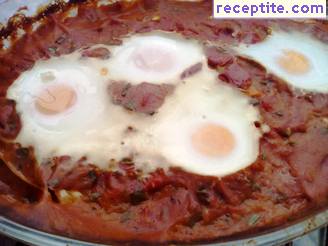 В тиган се загрява зехтинът и в него се запържват ситно нарязаният лук и счуканият чесън. Добавят се разреденото с 4 с.л. вода доматено пюре, нарязаните чушки, а след още 2-3 минути и обелените и нарязани на кубчета домати. Слагат се подправките и след няколко минути се чукват яйцата. Похлупва се с капак и след 2-3 минути ястието е готово. Поднася се в тигана, поръсено с магданоз или кориандър.
