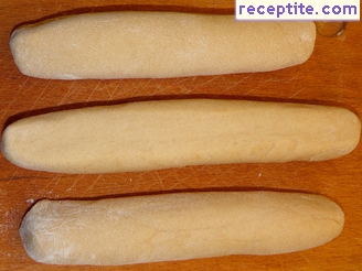 От приготвеното тесто оформете кръг с дебелина около 3 см, който разрежете на резени с дебелина 3 см. От получените резени оформете малки ролца с диаметър около 3 см. Получените ролца нарежете на парчета с дължина около 4 см.