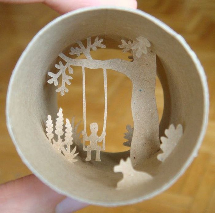 Anastassia Elias от Париж е художник, който комбинира оригинална идея с майсторство. Нейните произведения използват не платно, а рулца от тоалетна хартия. С остро ножче тя изрязва, издълбава и повдига части от картона и залепя допълнителни парченца за да постигне желаната картина. При подходящо осветление ефектът е впечатляващ.