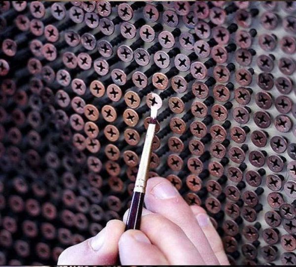 Андрю Майерс създава портрети използвайки винтове. Необходимото оцветяване и дълбочина на забиване в "платното" създават триизмерен ефект, който придава реалистичност на творбите.