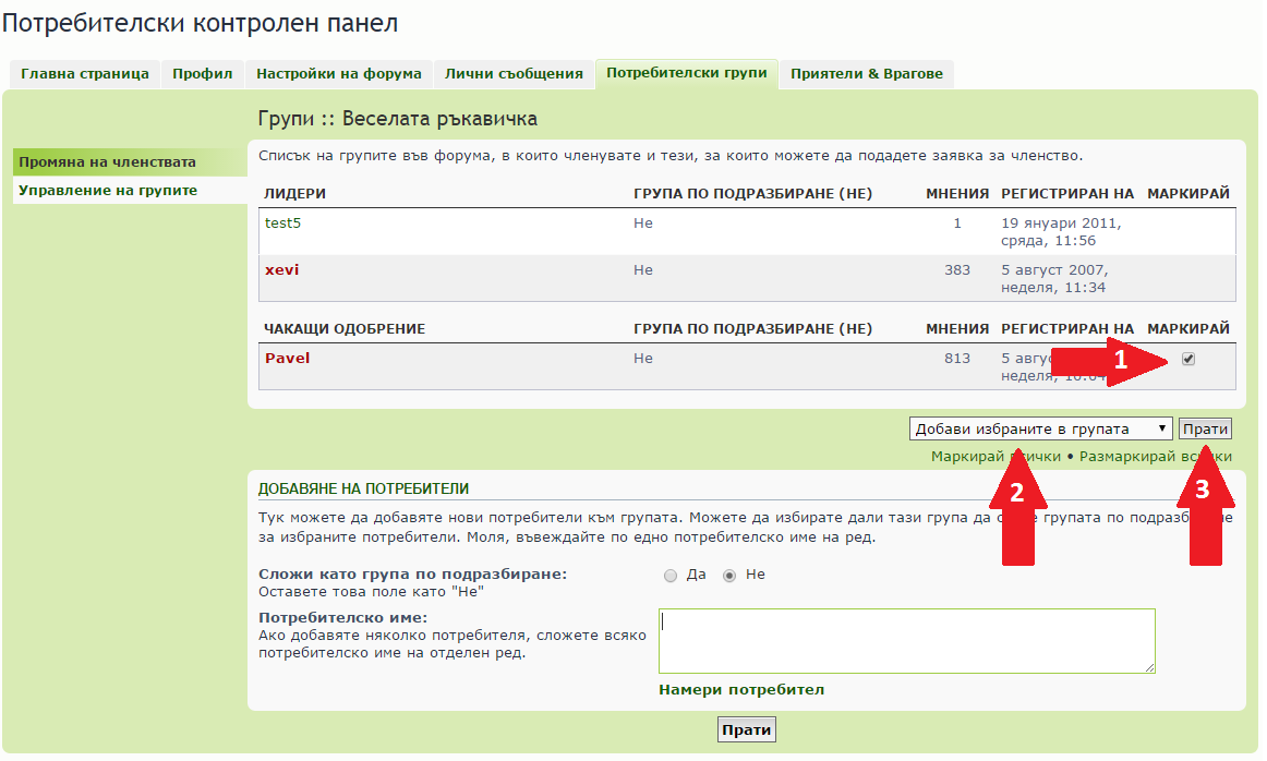 На тази страница има списък с чакащите одобрение заявки за членство. Първо се маркира кутийката в най-дясната колонка за желания потребител/потребители, второ от падащото меню под списъка се избира "Добави избраните в групата" и накрая се натиска бутона "Прати" (този точно до падащото меню).
