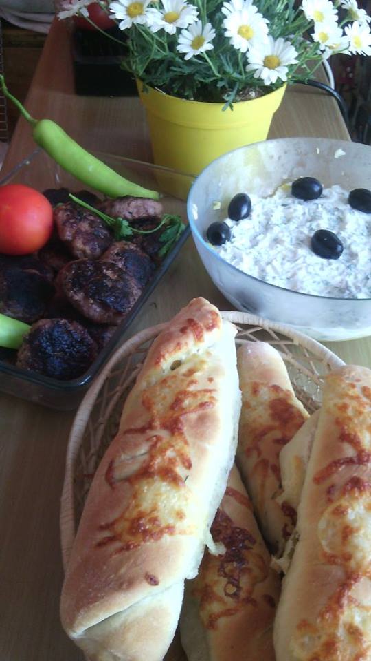 янкина салата /без яйца/,кюфтета на скара и багетки с ароматен пълнеж.Едните са със зехтин,чесън и копър ,а другите с зехтин,маслини и босилек