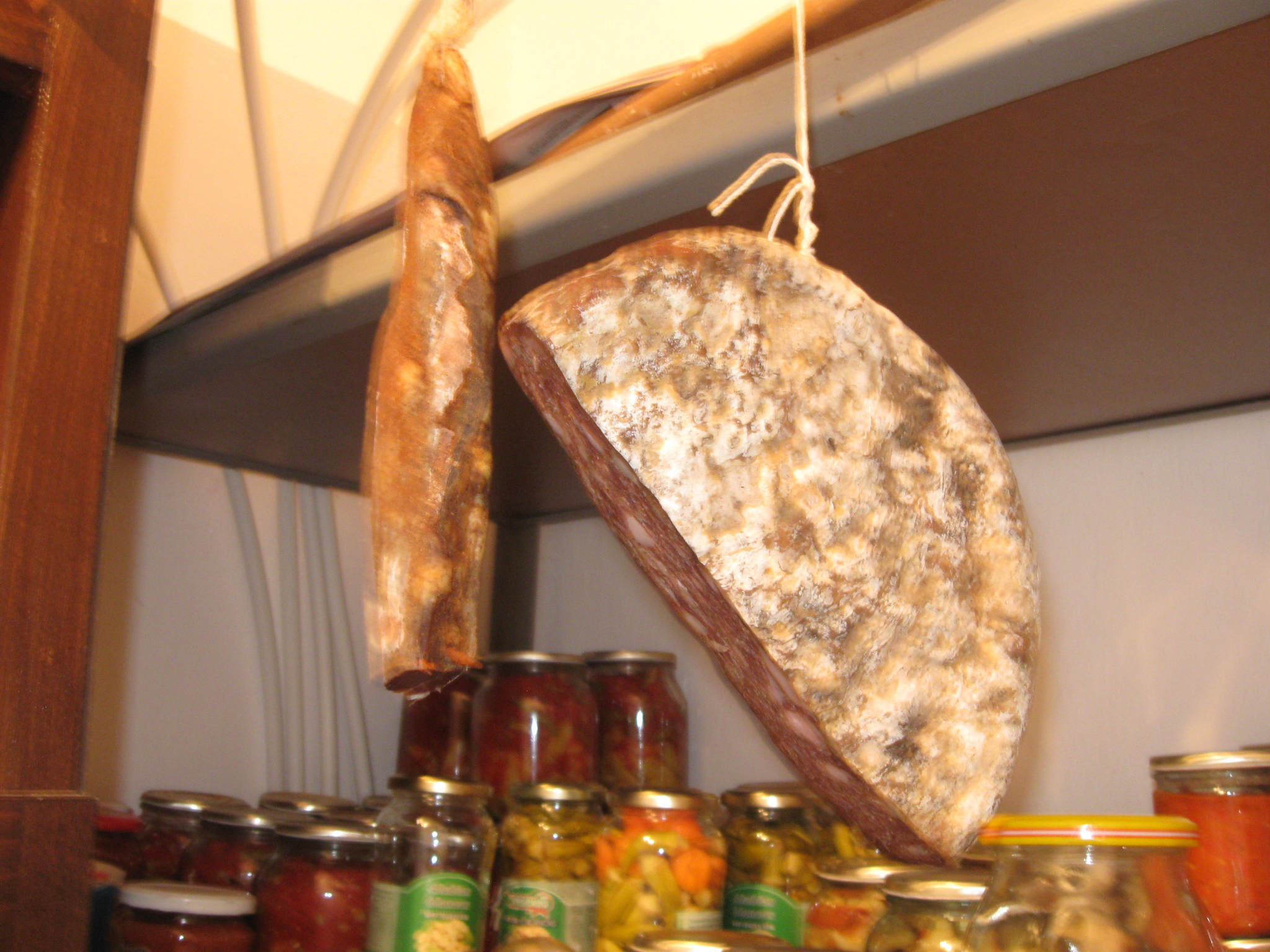 , и саламурена туршия от зелени домати. За десерт - сладък бисквитен салам с цели бисквити.