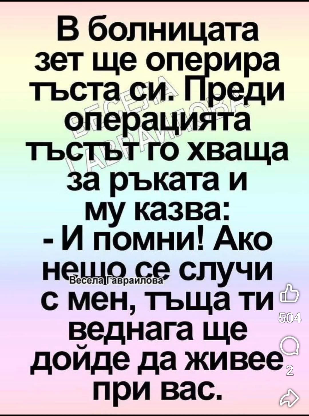 Дядо на 95 години отива при джипито си и му казва, че му трябва медицинско за брак. Докторът го пита, а булката на колко е? Дядото отговаря - на 18 години е. Тогава докторът казал деликатно, виж какво дядо. при някои случаи на интимни отношения може да се стигне до летален край. А дядото отговорил. виж докторе, то Божа работа,така й е било писано, тогава ще си намеря друга булка.