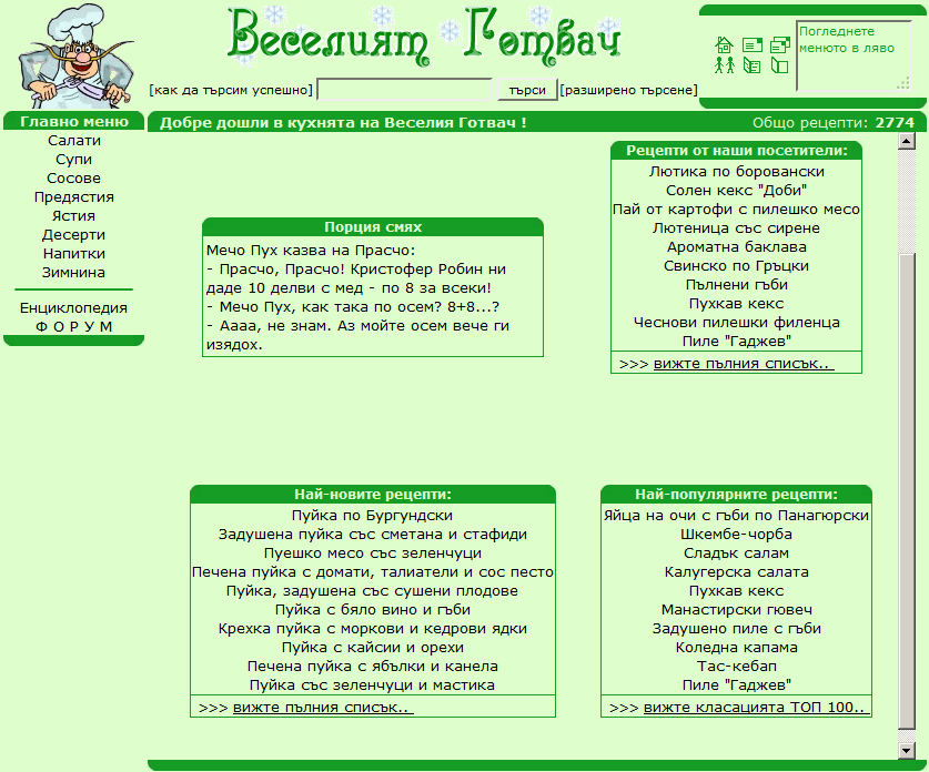 Едно топло лято вашите администратори, точно преди да заминат на море успяха да довършат своя малък проект - резултатът от няколко месеца усилен труд, а именно - първата версия на Веселият Готвач. Така започна - с изключително прост дизайн и около 300 рецепти. От тогава до сега хиляди Весели Готвачи дадоха своя принос във формата на рецепти, снимки, коментари, мнения, идеи и така за 12 години сайтът се превърна в това, което е днес. Благодарим на всички вас, които с ентусиазъм участвате и обогатявате Веселият Готвач