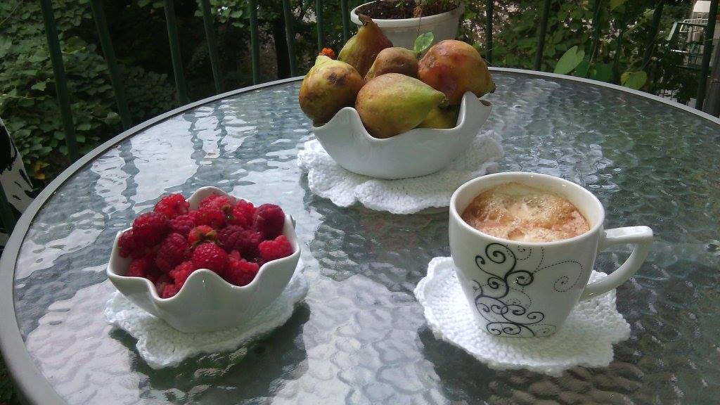 Аз я стартирам на балкона.През седмицата докато нямаше хора и се чудех с какво да си уплътня времето изплетох едни малки кръглички подложки,вчера децата и брат ми донесоха плодове от вилата .Сядам да споделя кафето с вас и се залавям с летни ястия от продукти собствено производство,вярно бавно стават ама са вкусни а и зная ,че ще има кои да ги хапне.
