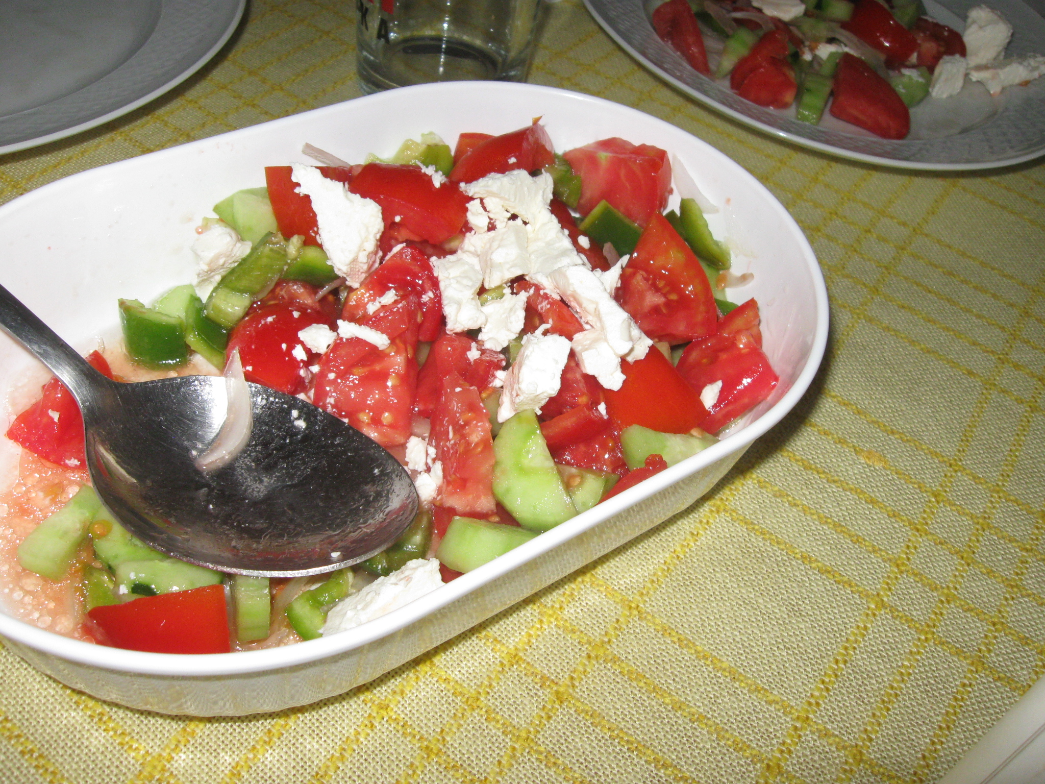 Обядът е готов. Кюфтета на скара, чушки сьс сирене и яйца на фурна, таратор, момичетата направиха тосканска салата. Десерта е диня и баклава/от турски ресторант/