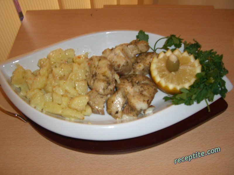 Риба по средиземноморски в плик със варени картофи с пармезан