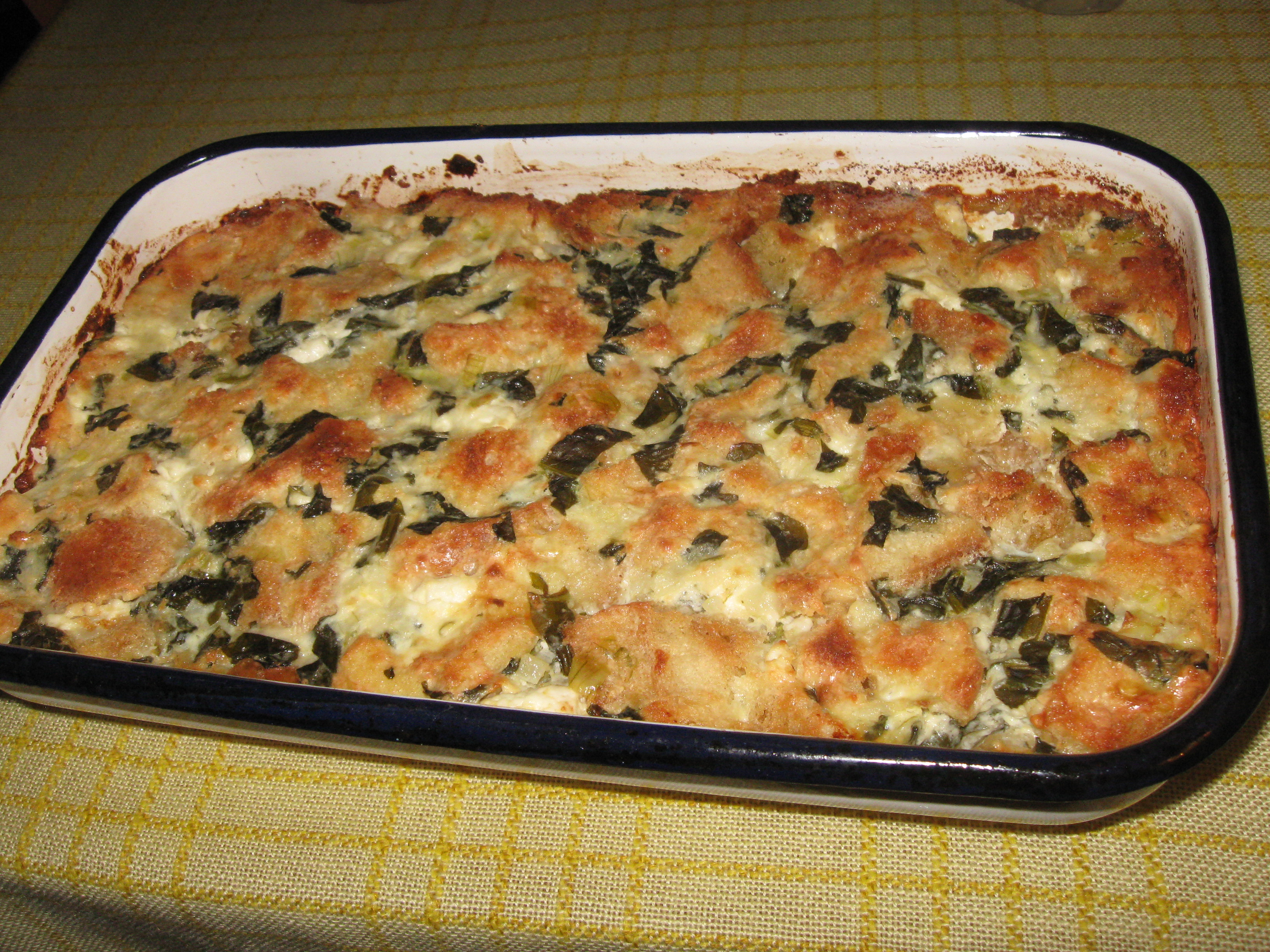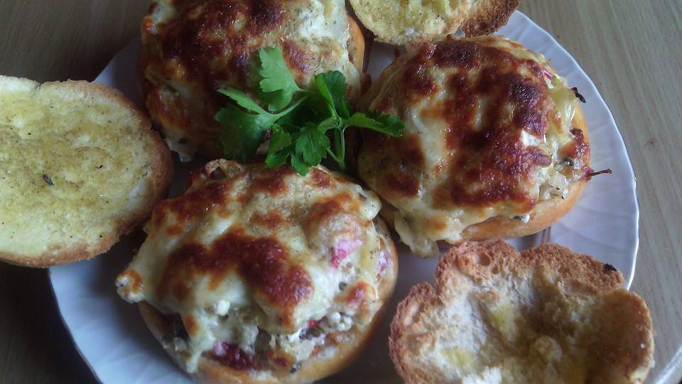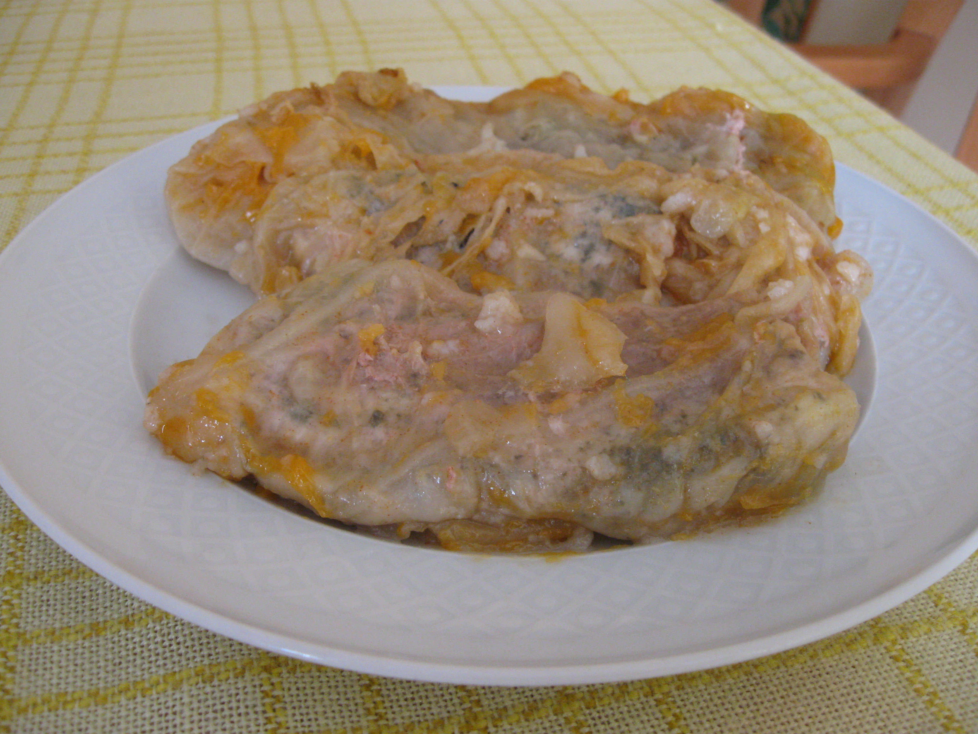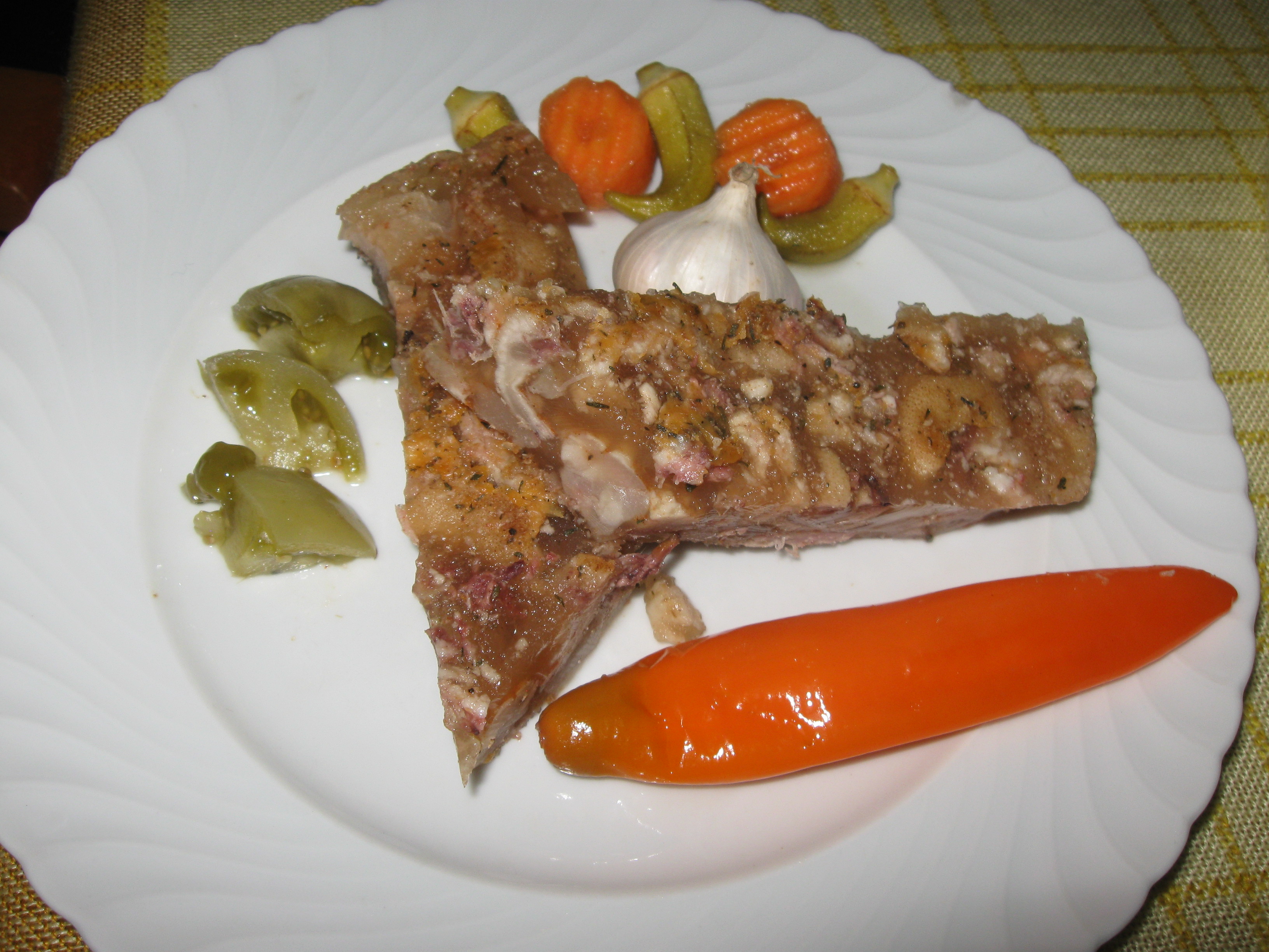 обезкостени свински крачета с подправки баница от хляб с много краве масло сирене и яйца- става като бюрек и доматчета кисели
