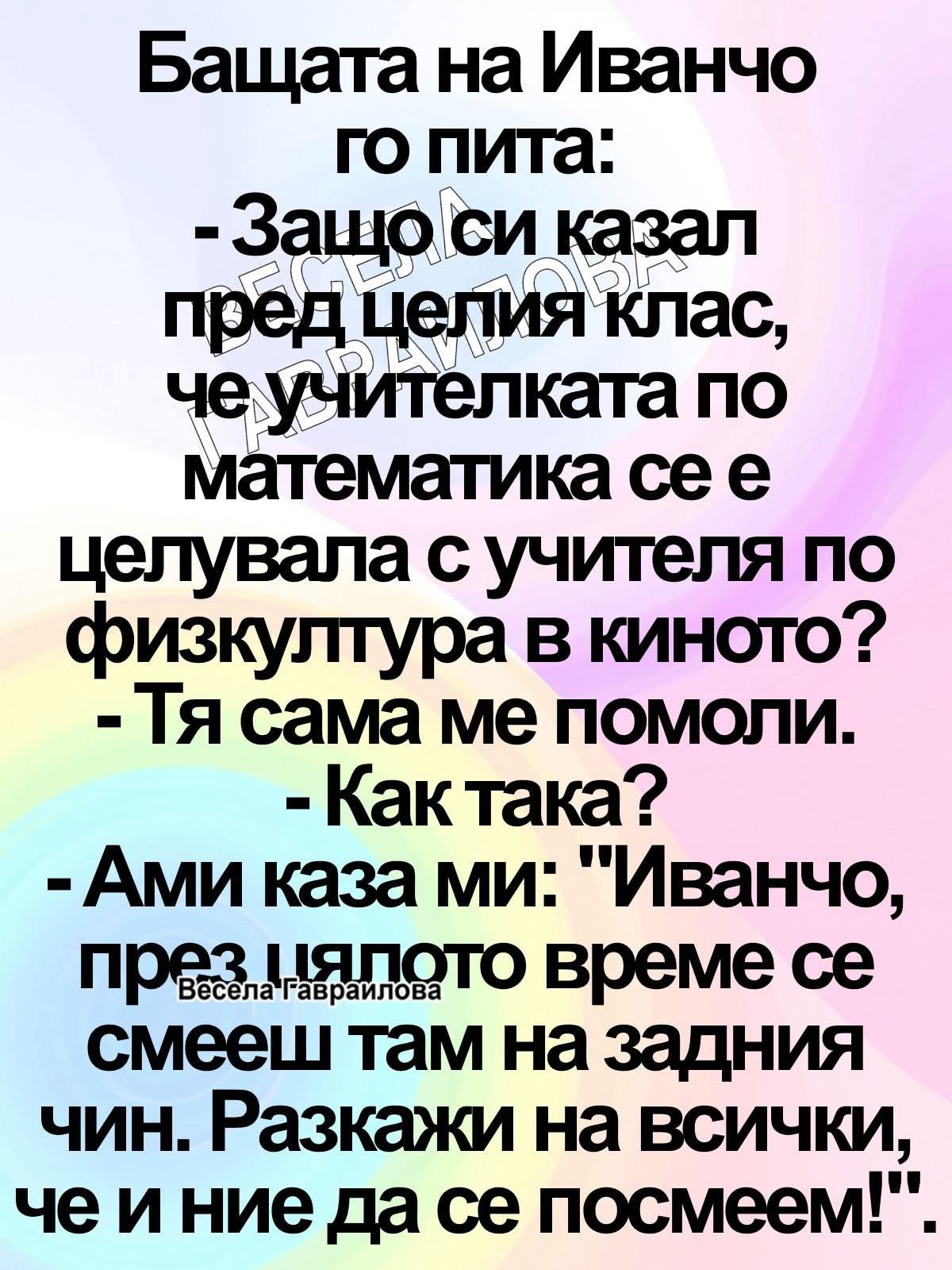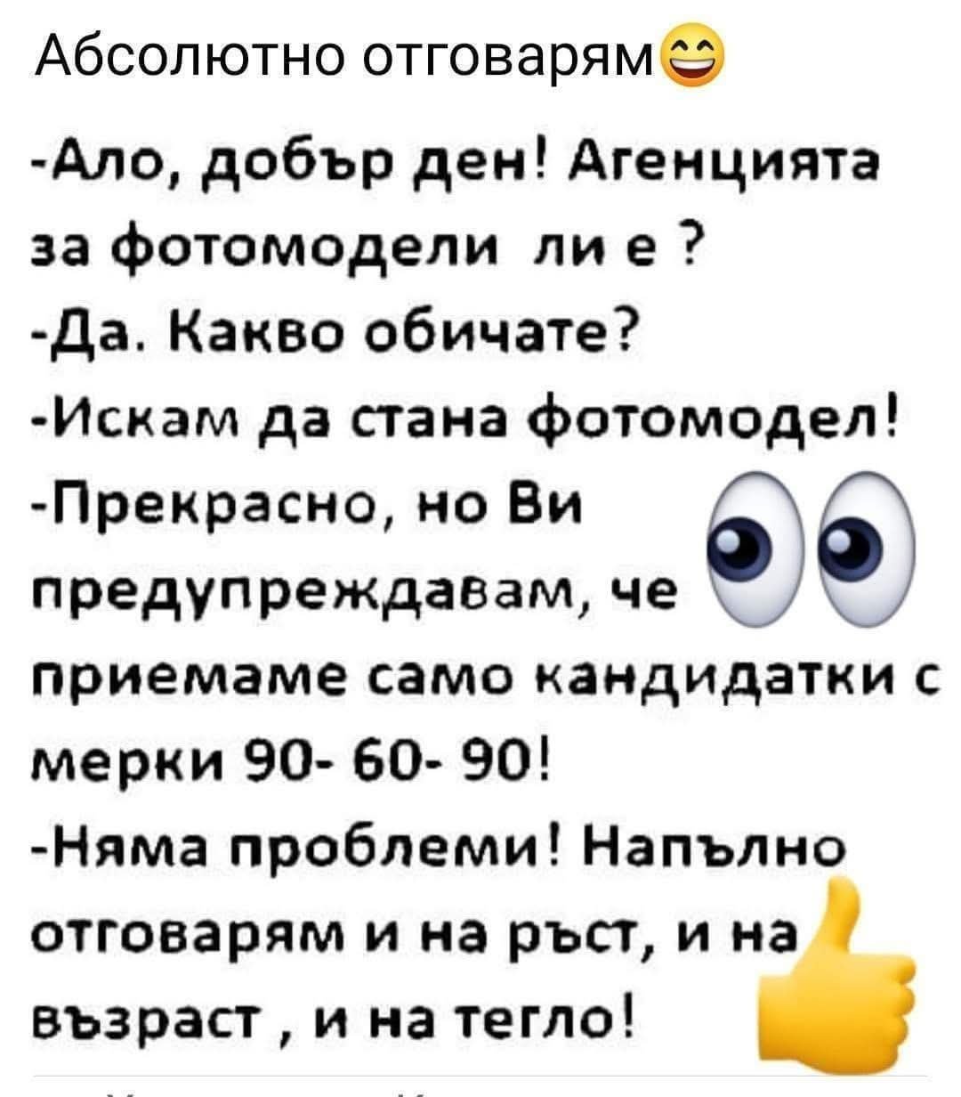 Дядо на 95 години отива при джипито си и му казва, че му трябва медицинско за брак. Докторът го пита, а булката на колко е? Дядото отговаря - на 18 години е. Тогава докторът казал деликатно, виж какво дядо. при някои случаи на интимни отношения може да се стигне до летален край. А дядото отговорил. виж докторе, то Божа работа,така й е било писано, тогава ще си намеря друга булка.