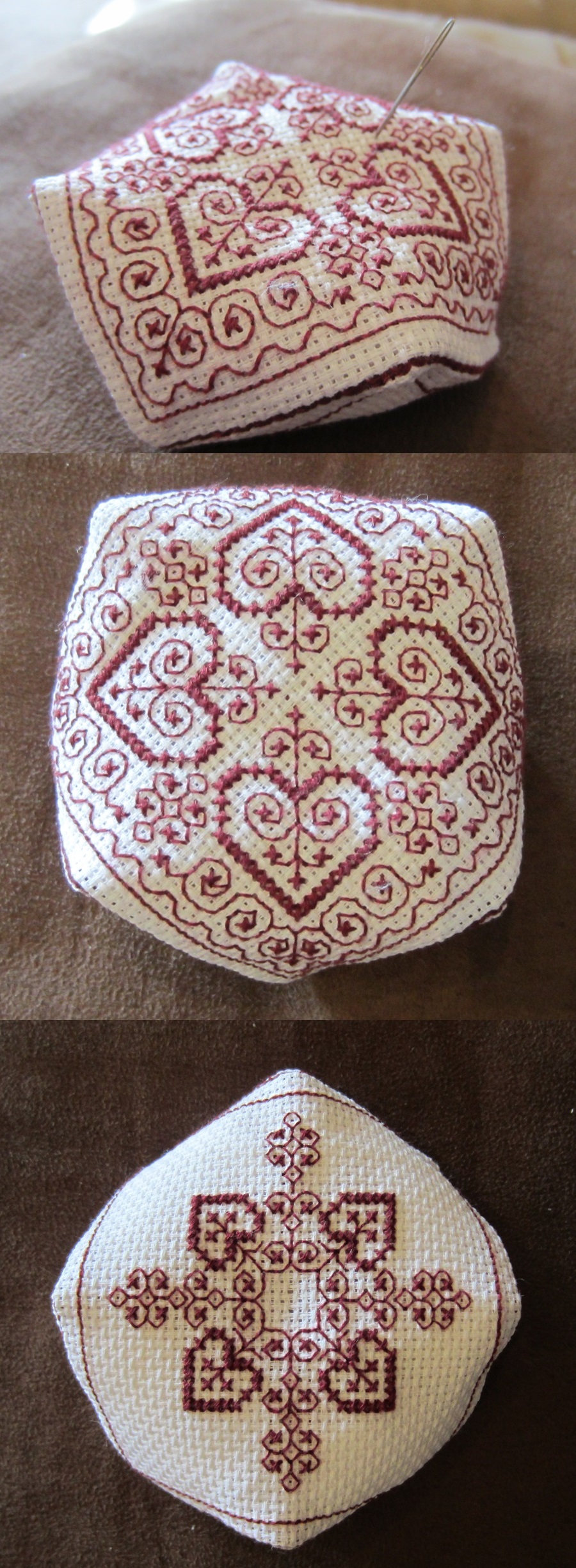 Тази сутрин завърших и първия си игленик или т.н. бискорно. След като няколко пъти си губих иглите- забодени къде ли не, най-накрая реших да си направя игленик. Избродирах го преди 2 седмици, но едва тази сутрин го сглобих- доста се озорих докато го зашия. Чудех се колко памук да сложа- повече или по-малко. Махах, слагах памук и най-накрая ми писна и го заших. Честно казано- хареса ми