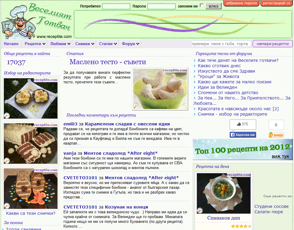 Едно топло лято вашите администратори, точно преди да заминат на море успяха да довършат своя малък проект - резултатът от няколко месеца усилен труд, а именно - първата версия на Веселият Готвач. Така започна - с изключително прост дизайн и около 300 рецепти. От тогава до сега хиляди Весели Готвачи дадоха своя принос във формата на рецепти, снимки, коментари, мнения, идеи и така за 12 години сайтът се превърна в това, което е днес. Благодарим на всички вас, които с ентусиазъм участвате и обогатявате Веселият Готвач