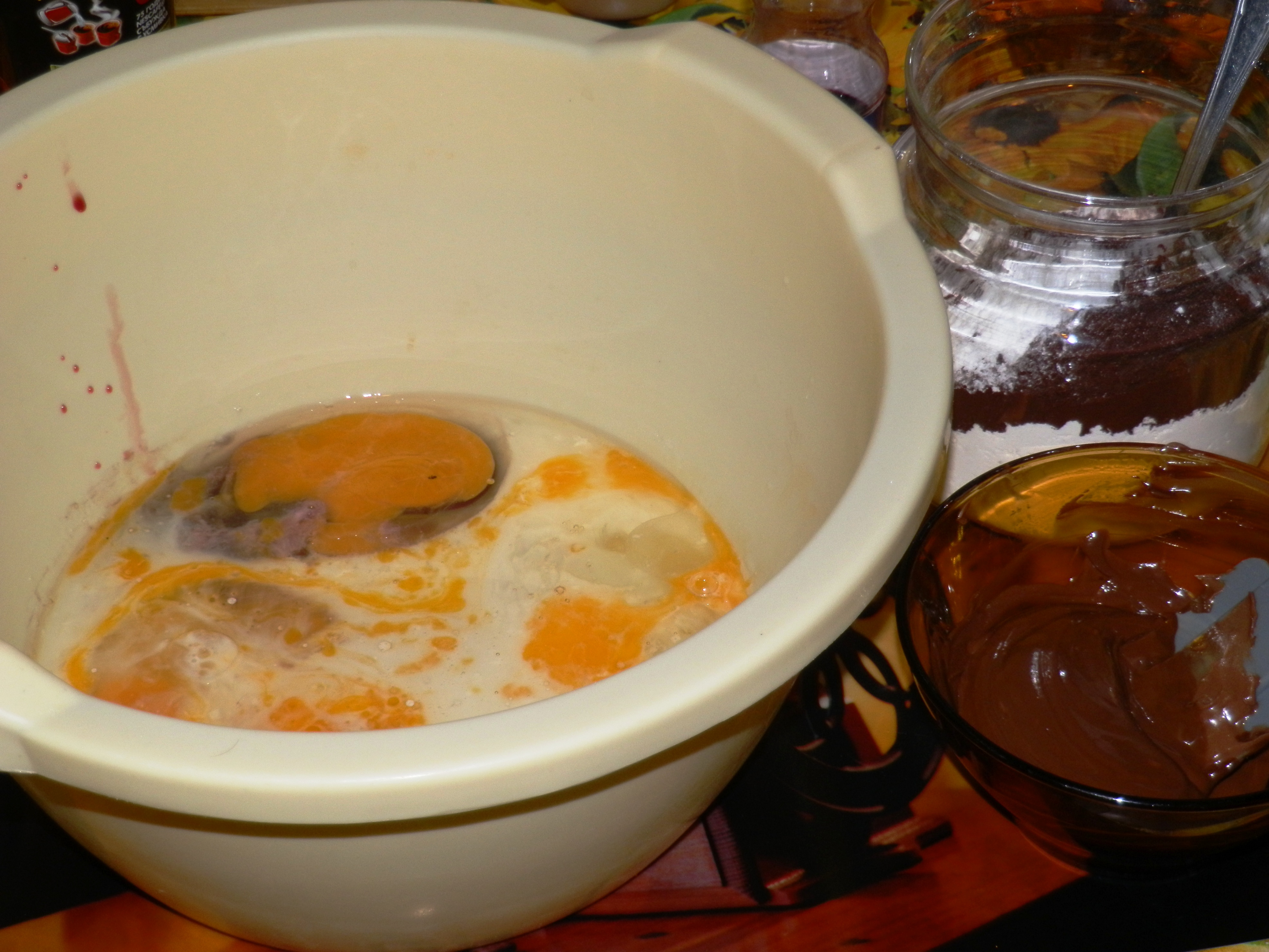 2.Разбих с бъркалка, а не с миксер, докато захарта на дъното се разтопи. Добавих лъжица по лъжица брашняната смес. Накрая течния шоколад - 200 грама, леко разтопен в микровълнова.